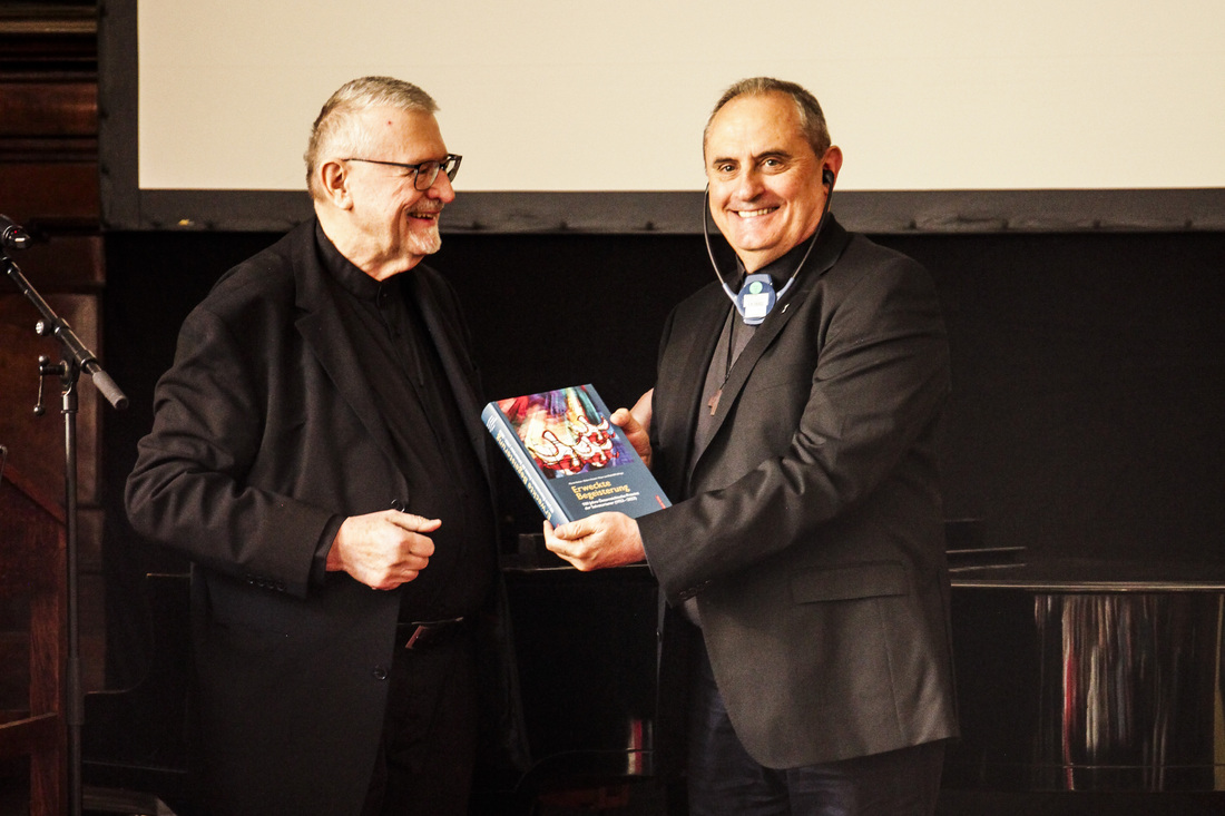 Provinzial P. Josef Wonisch SDS überreichte Generaloberen P. Milton Zonta SDS offiziell das Jubiläumsbuch. (c) Manu Nitsch