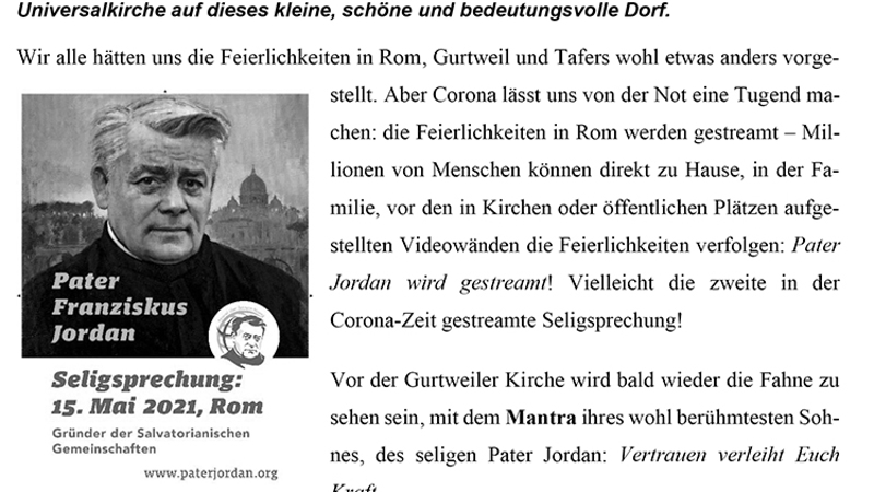 Wir alle hätten uns die Feierlichkeiten in Rom, Gurtweil und Tafers wohl etwas anders vorgestellt. Aber Corona lässt uns von der Not eine Tugend machen: die Feierlichkeiten in Rom werden gestreamt – Millionen von Menschen können direkt zu Hause, in der Familie, vor den in Kirchen oder öffentlichen Plätzen aufgestellten Videowänden die Feierlichkeiten verfolgen: Pater Jordan wird gestreamt! (Live-Streaming: https://telepacenews.it/ diretta/) Vielleicht die zweite in der Corona-Zeit gestreamte Seligsprechung!