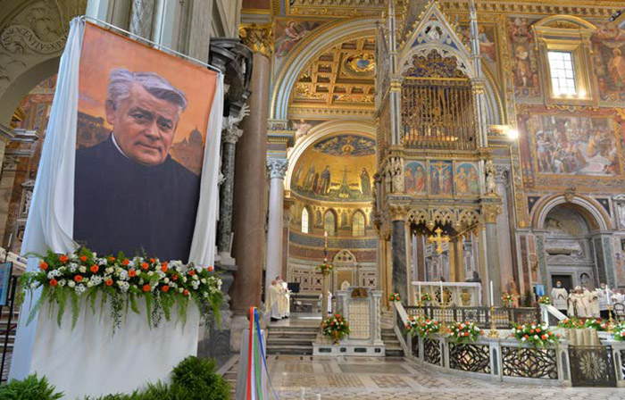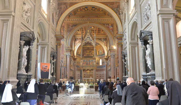 Genau eine halbe Stunde später zog die Prozession in die historische Basilika ein, begleitet von schöner Musik und Gesang unter der Leitung von Don Marco Frisina, dem bekannten Chorleiter der Kathedrale von Rom. Wie vom Heiligen Stuhl festgelegt, begann die Zeremonie der Seligsprechung mit der formellen Bitte unseres Generaloberen, Franziskus Maria vom Kreuz Jordan in das Buch der Seligen einzuschreiben, worauf die Verlesung einer kurzen Biographie durch Generalpostulator P. Adam Teneta folgte. In feierlicher Weise verkündete der Kardinal offiziell das Apostolische Schreiben des Papstes: