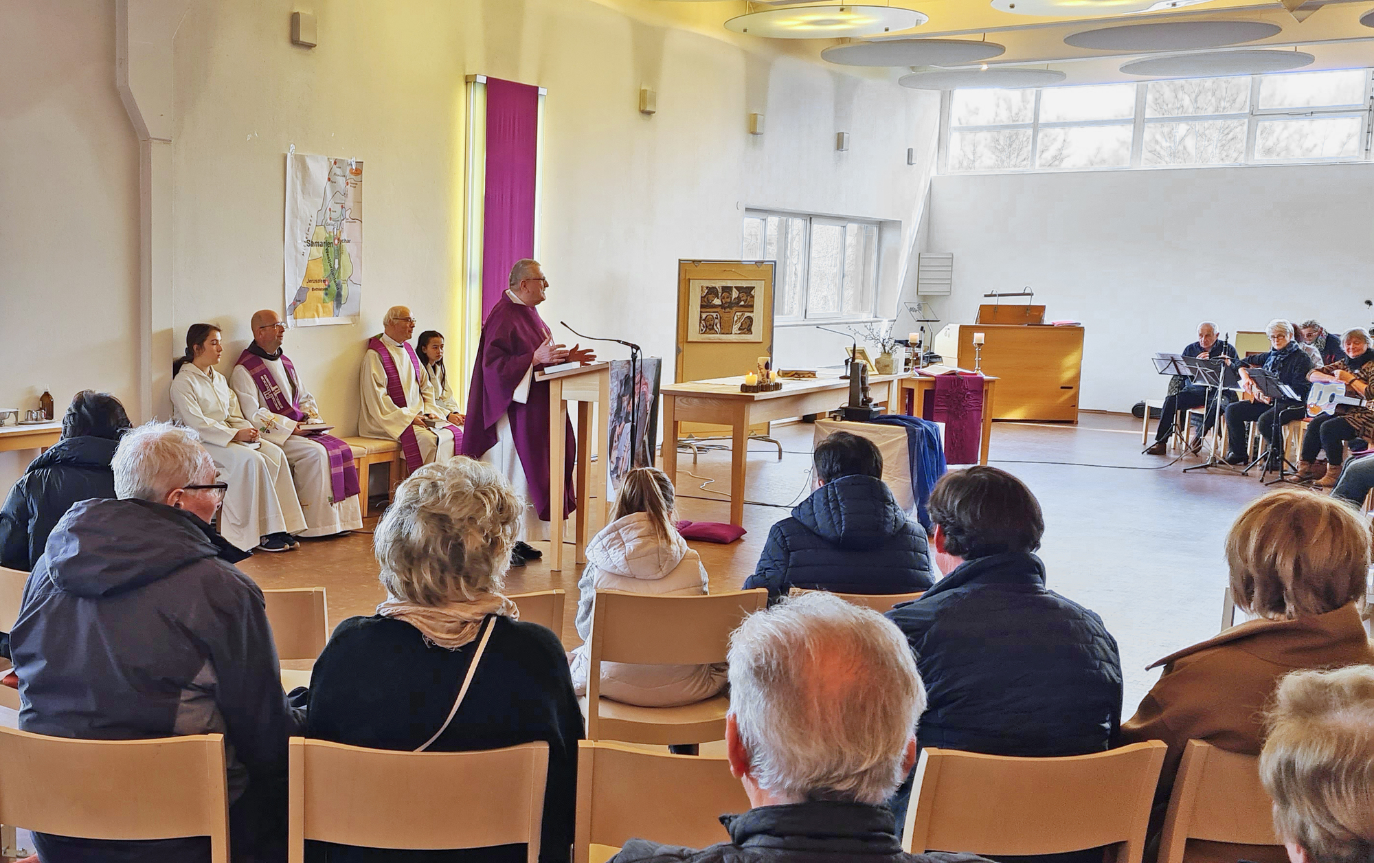 Die Feier bestand aus einem Gottesdienst, musikalisch mit Gitarre und Klarinette begleitet, der anschließenden Buchpräsentation sowie aus Pfarrcafé und der Möglichkeit zum Austausch. Der Kirchenbau aus den 1970er-Jahren wirkt von außen unscheinbar und klein – doch die Pfarrgemeinde, die den Innenraum füllte, war groß: beinahe einhundert Menschen waren anwesend.