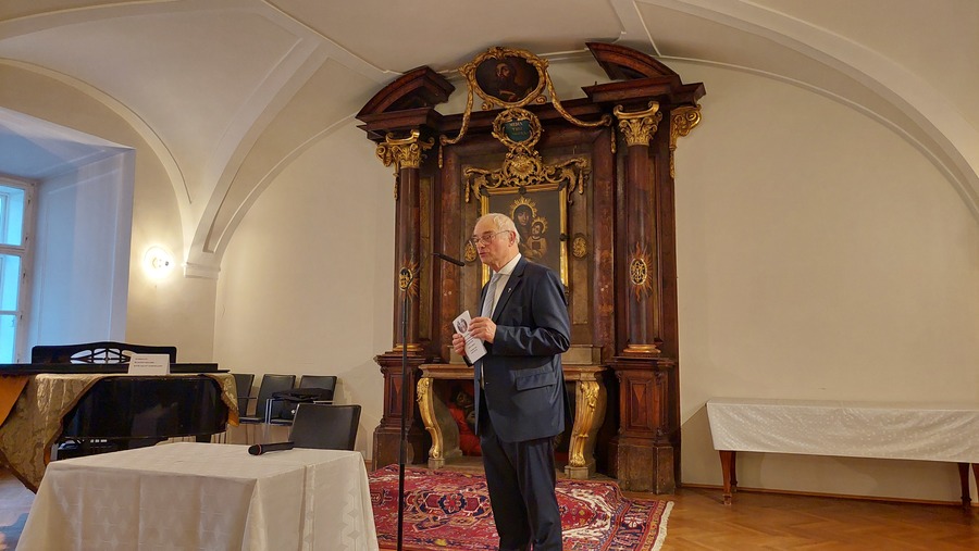 P. Provinzial Márton Gál begrüßte die zahlreich erschienenen Gäste im Kapitelsaal des Klosters St. Michael. In seiner Ansprache stellte er die Frage, ob man in Zeiten künstlicher Intelligenz überhaupt noch ein Forschungsinstitut brauche. KI-Systeme könnten viele Berufe ersetzen, so auch Historiker:innen, und sogar Fachbücher innerhalb weniger Stunden verfassen. „Doch all das ist Technik. Wir fragen uns: Wo bleibt das Herz? Es braucht nicht nur Verstand – es braucht auch Herz“, so P. Provinzial Márton Gál. Hinter dem Forschungsinstitut stünden Menschen, Gesichter, Herz und Geist. Und gerade sie seien es, die uns mit dem Wissen der Vergangenheit auf die Zukunft vorbereiteten.