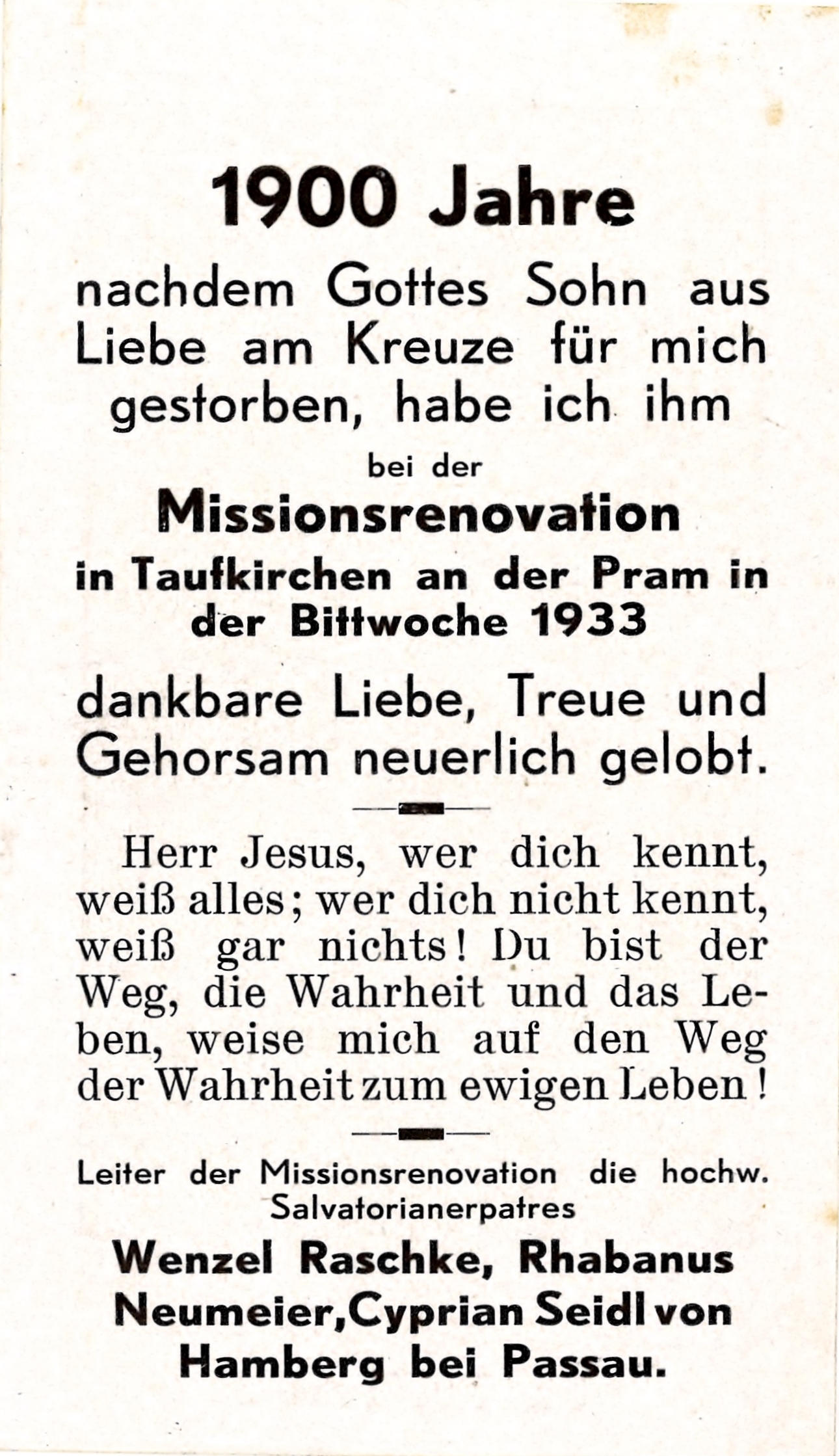 - Gebetsbildchen der Missionsrenovation der drei Patres in Taufkirchen an der Pram/Oberösterreich, 1933.