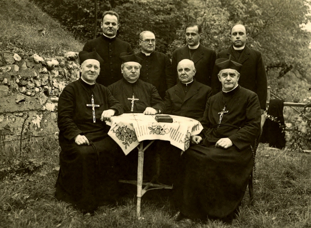 - Gruppenbild Volksmission, 1. Reihe sitzend von links: PP. Wenzeslaus Raschke, Rhabanus Neumeier, rechts: P. Cyprian Seidl, oberösterreichischer oder süddeutscher Raum, 1932-36