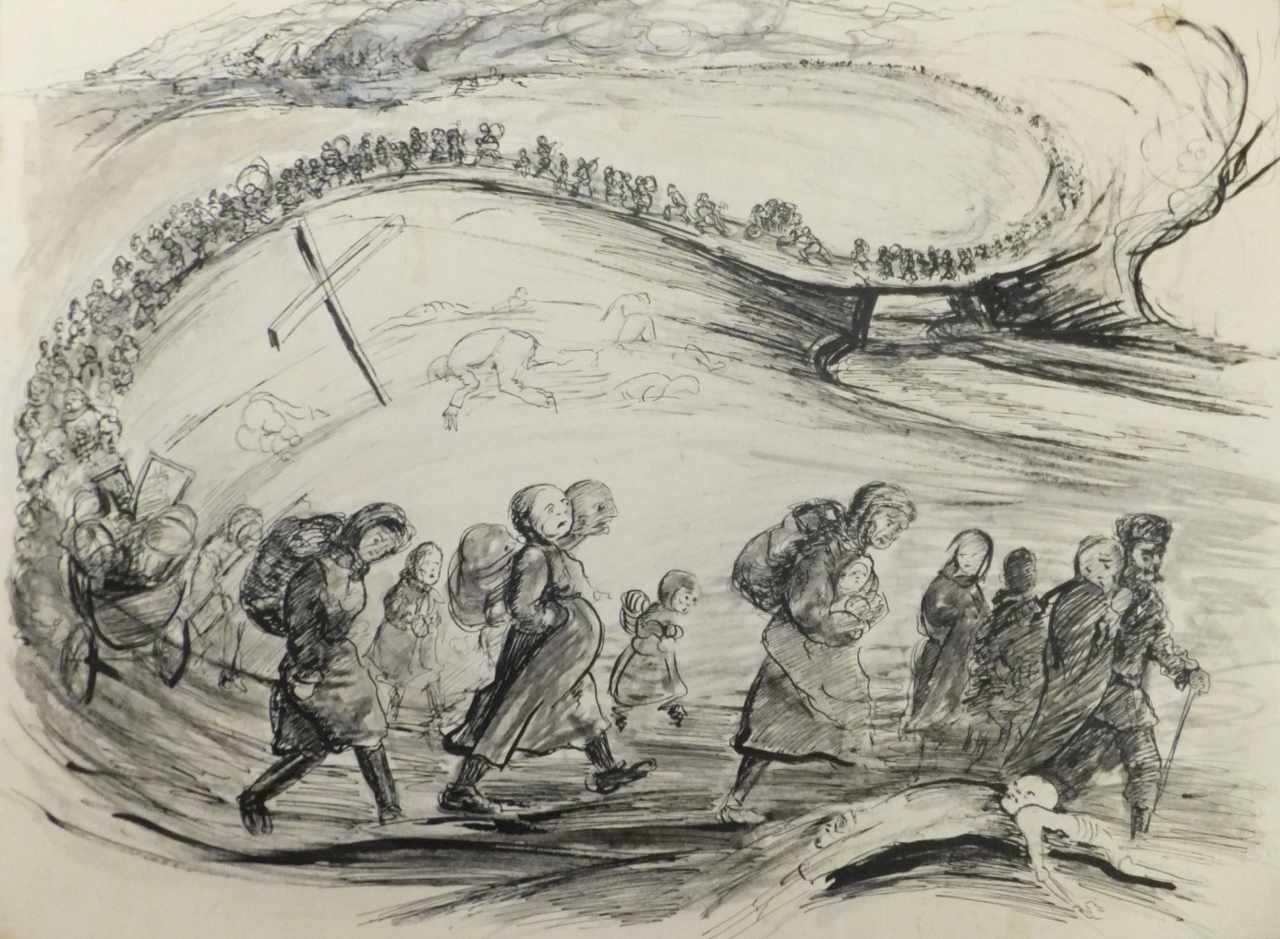 P. Waldemar Posch, Russische Impression – Flucht, o. D. (1950er-Jahre?), 42,5 x 30,5 cm
